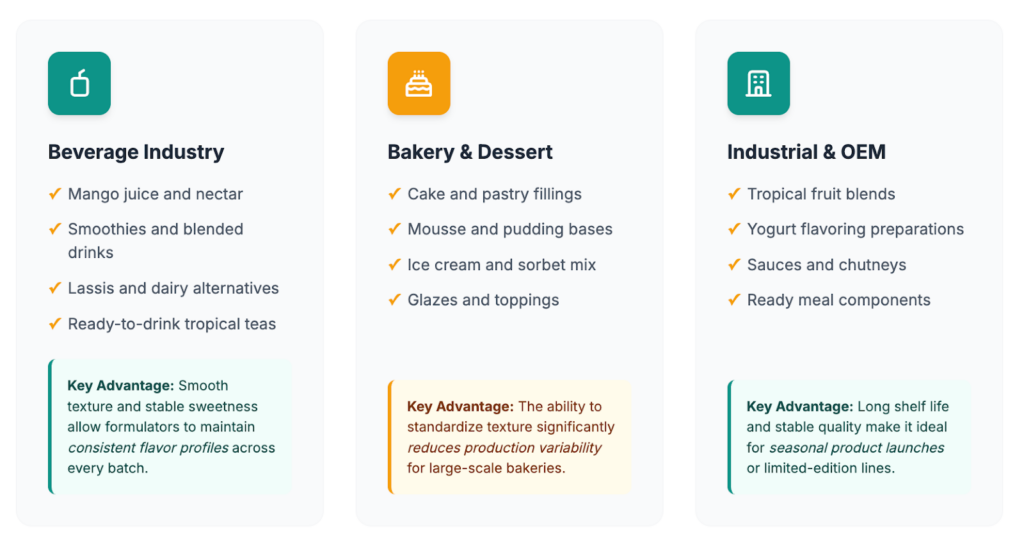 Because it is sterilized and sealed, canned mango pulp can be stored for extended periods without refrigeration prior to opening. This greatly simplifies logistics for importers and distributors.