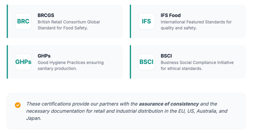 Manufacturing operations in Thailand focus on taste and quality, supply consistency, hygiene, and scalability. This allows suppliers to serve a wide range of clients—from large supermarkets to specialty food manufacturers.